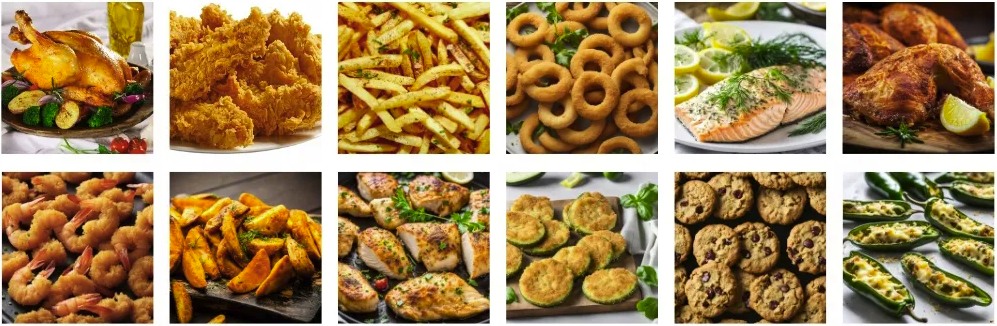 Zaawansowany obieg gorącego powietrza zapewnia równomierne pieczenie i chrupiący efekt bez oleju.