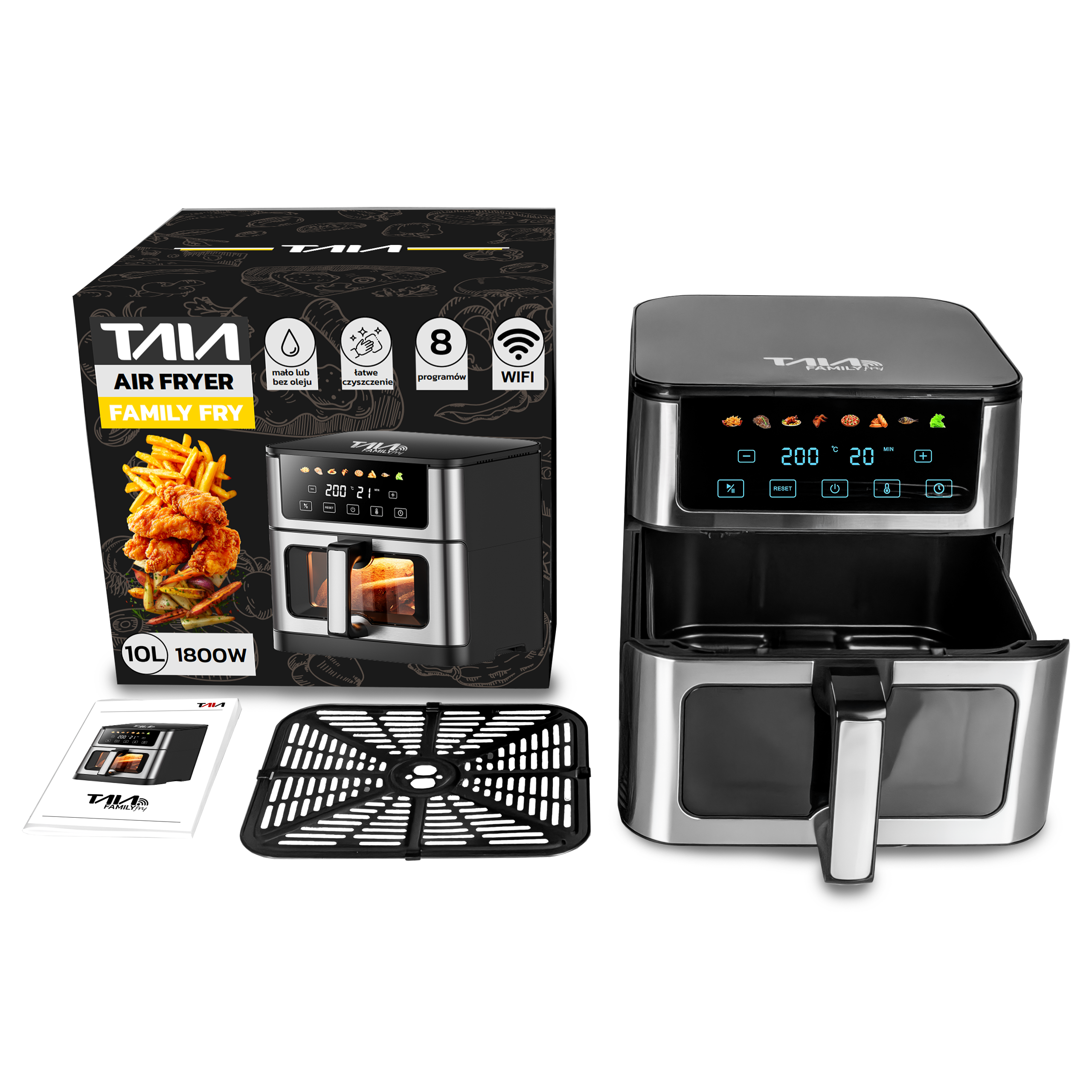 Duża Frytkownica beztłuszczowa Air Fryer TAIA Family Fry Wi-Fi 10 L z oknem podglądu, panel LED, 10 programów, 1800W