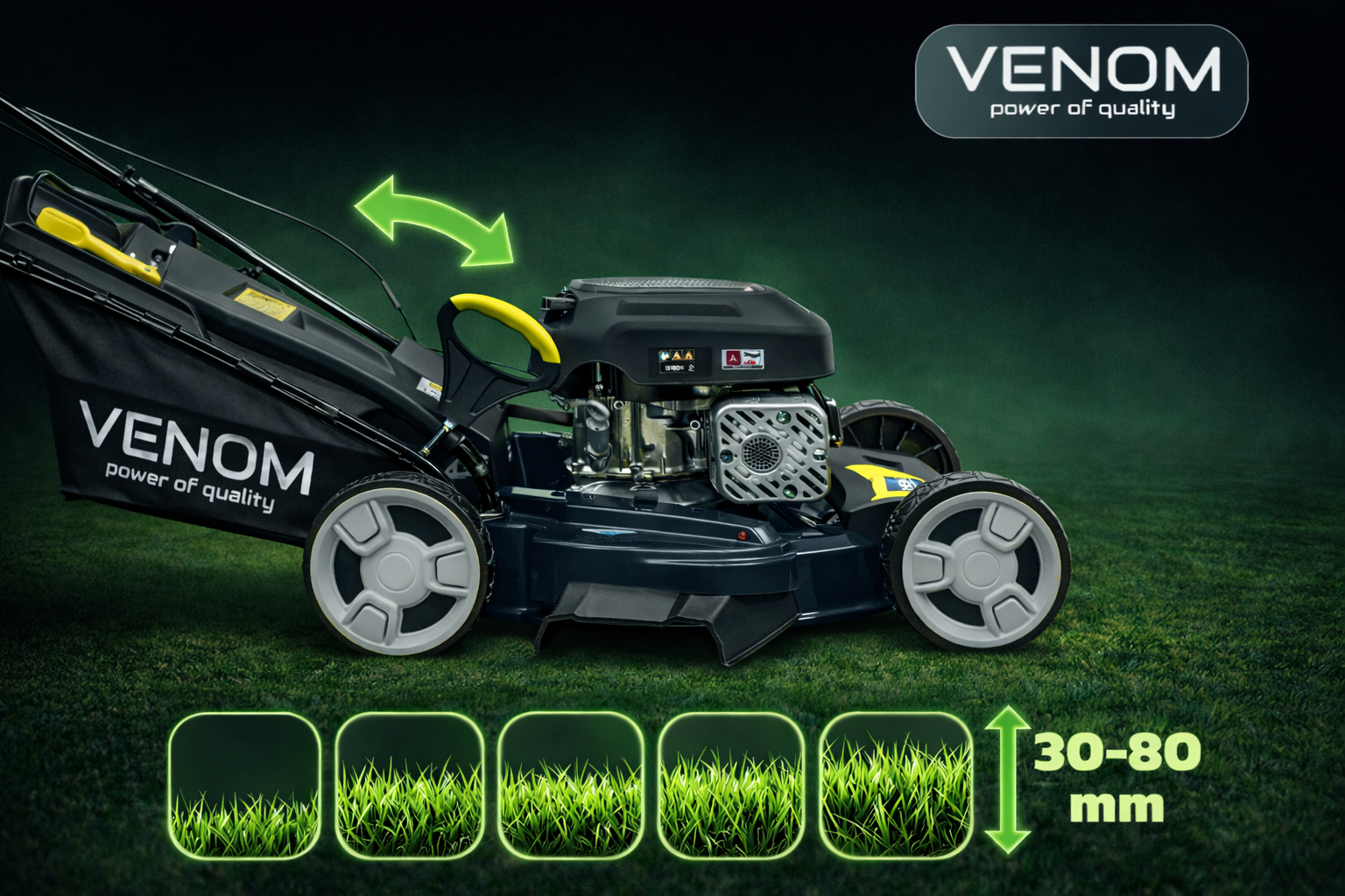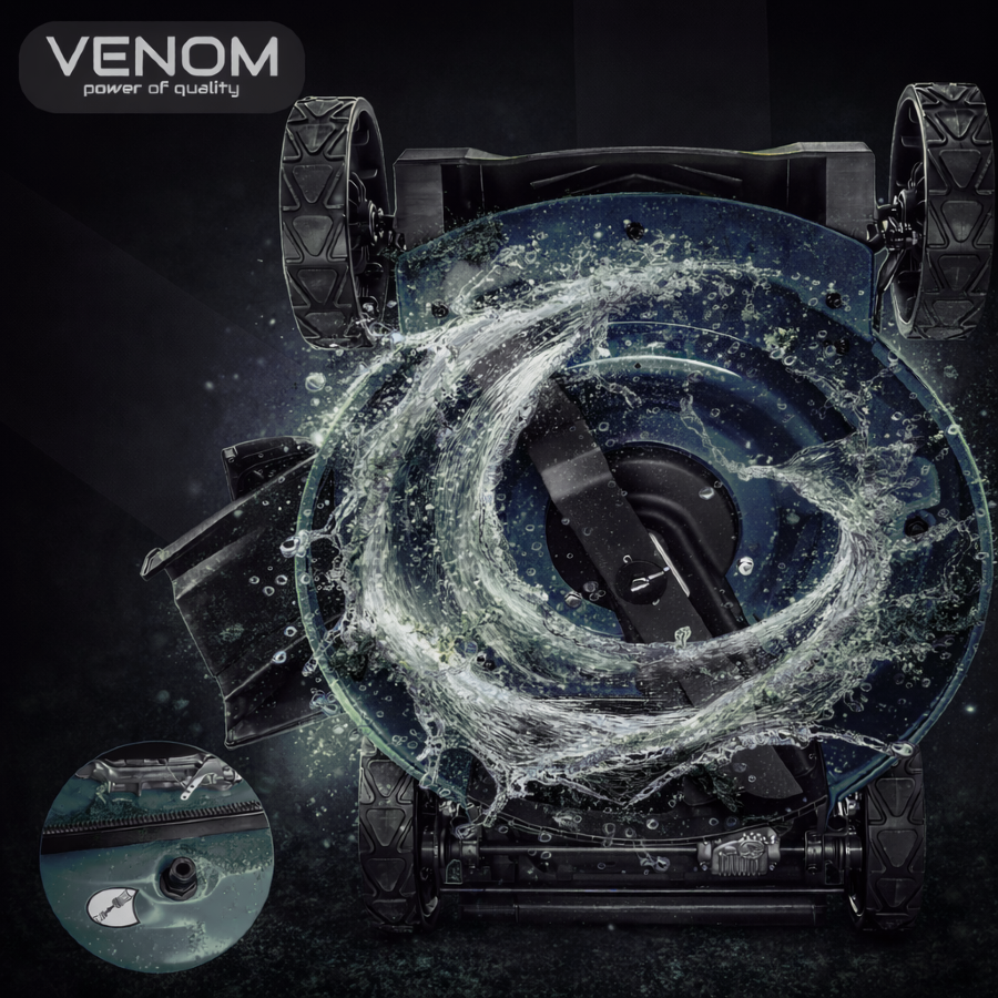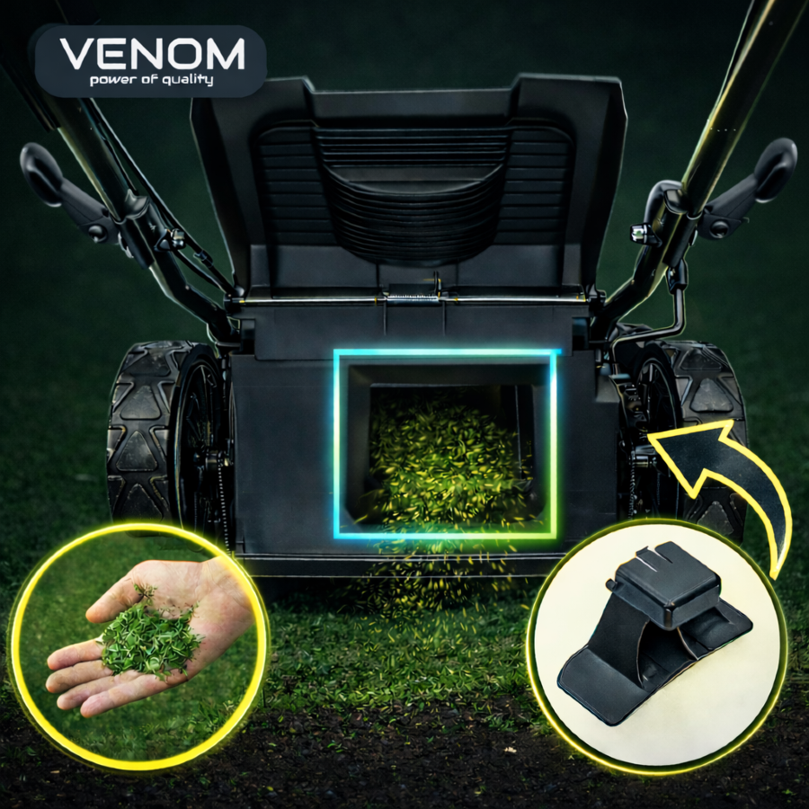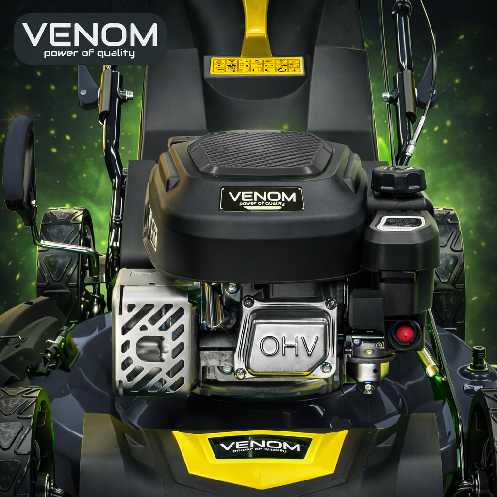✅VENOM PowerDrive™ – wzmocniona przekładnia napędowa, zapewniająca płynną pracę i stabilne prowadzenie kosiarki nawet na nierównym terenie.