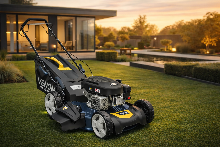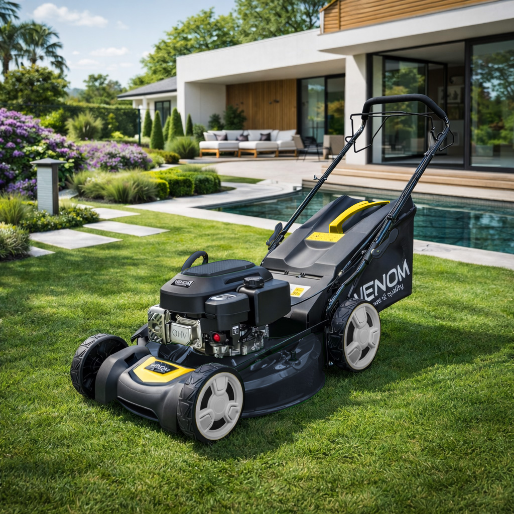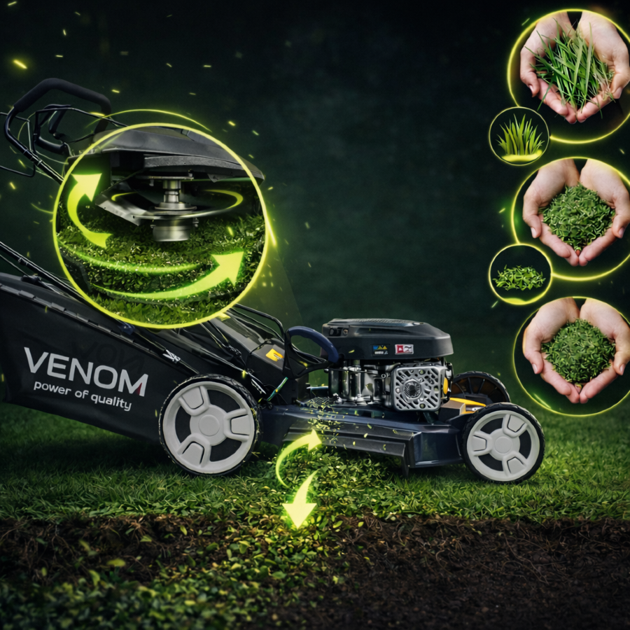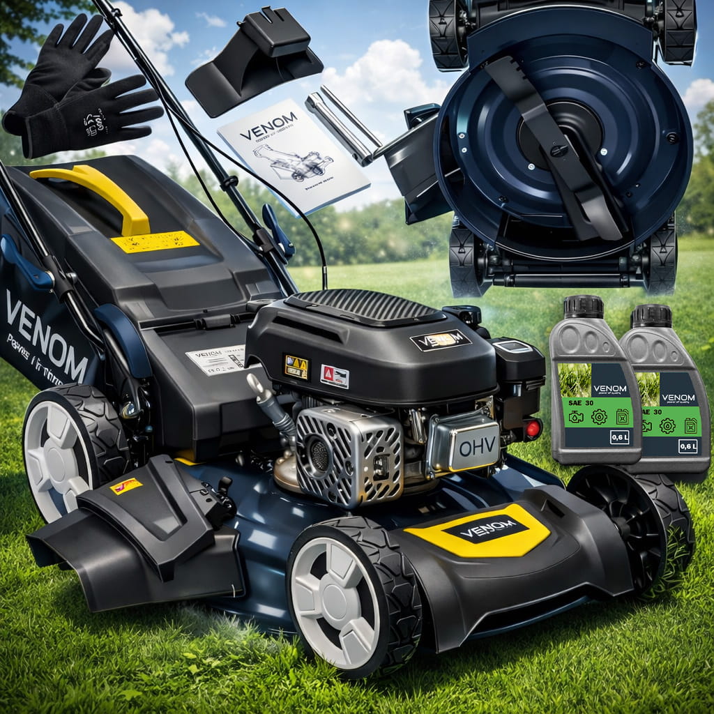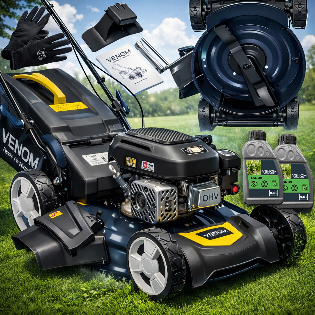 ✅VENOM PowerDrive™ – wzmocniona przekładnia napędowa, zapewniająca płynną pracę i stabilne prowadzenie kosiarki nawet na nierównym terenie.