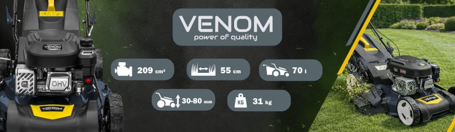 Moc znamionowa 3,1 kW oraz silnik VENOM 209cc zapewniają wysoką wydajność koszenia nawet w gęstej i wysokiej trawie.