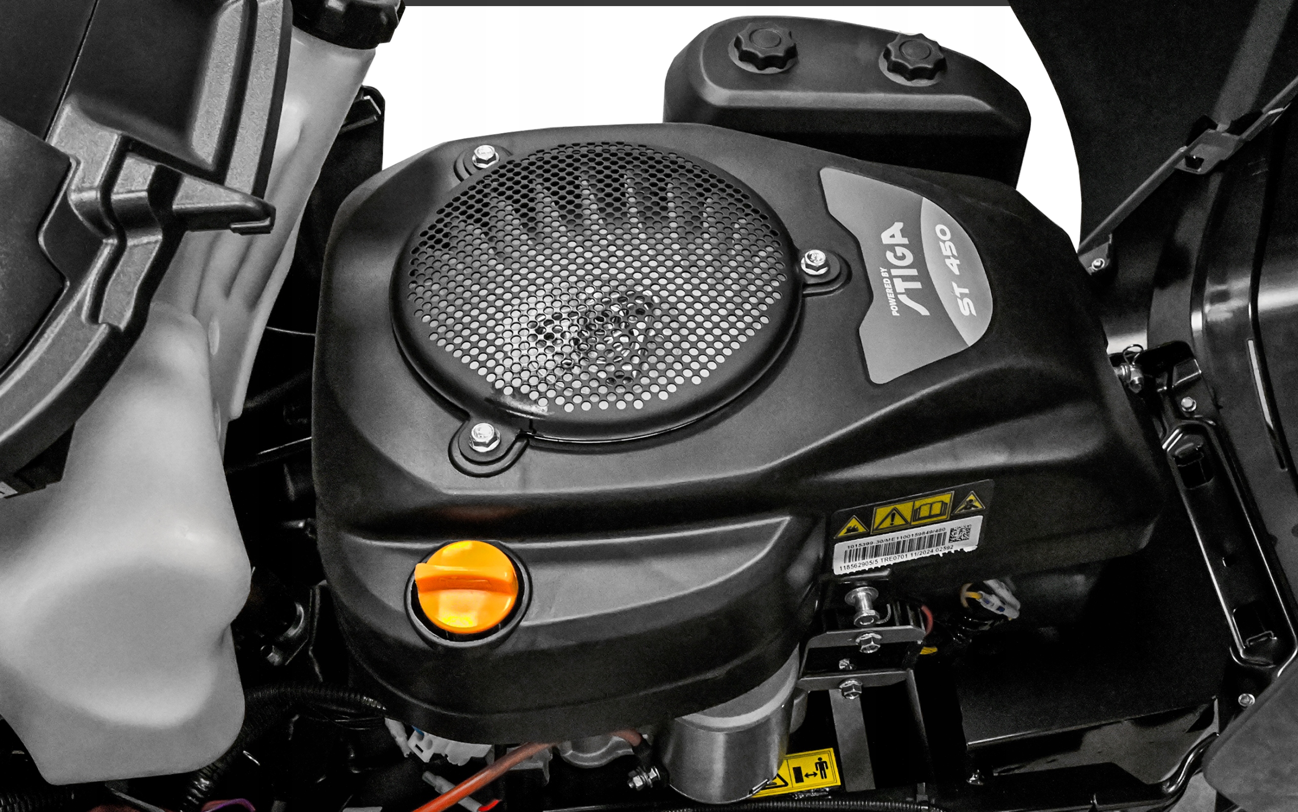 ✅ STIGA EcoTorque™ 432cc – silnik o wysokim momencie obrotowym, z żeliwnymi tulejami i systemem oszczędnego spalania – zaprojektowany do pracy na dużych powierzchniach i w trudnym terenie.