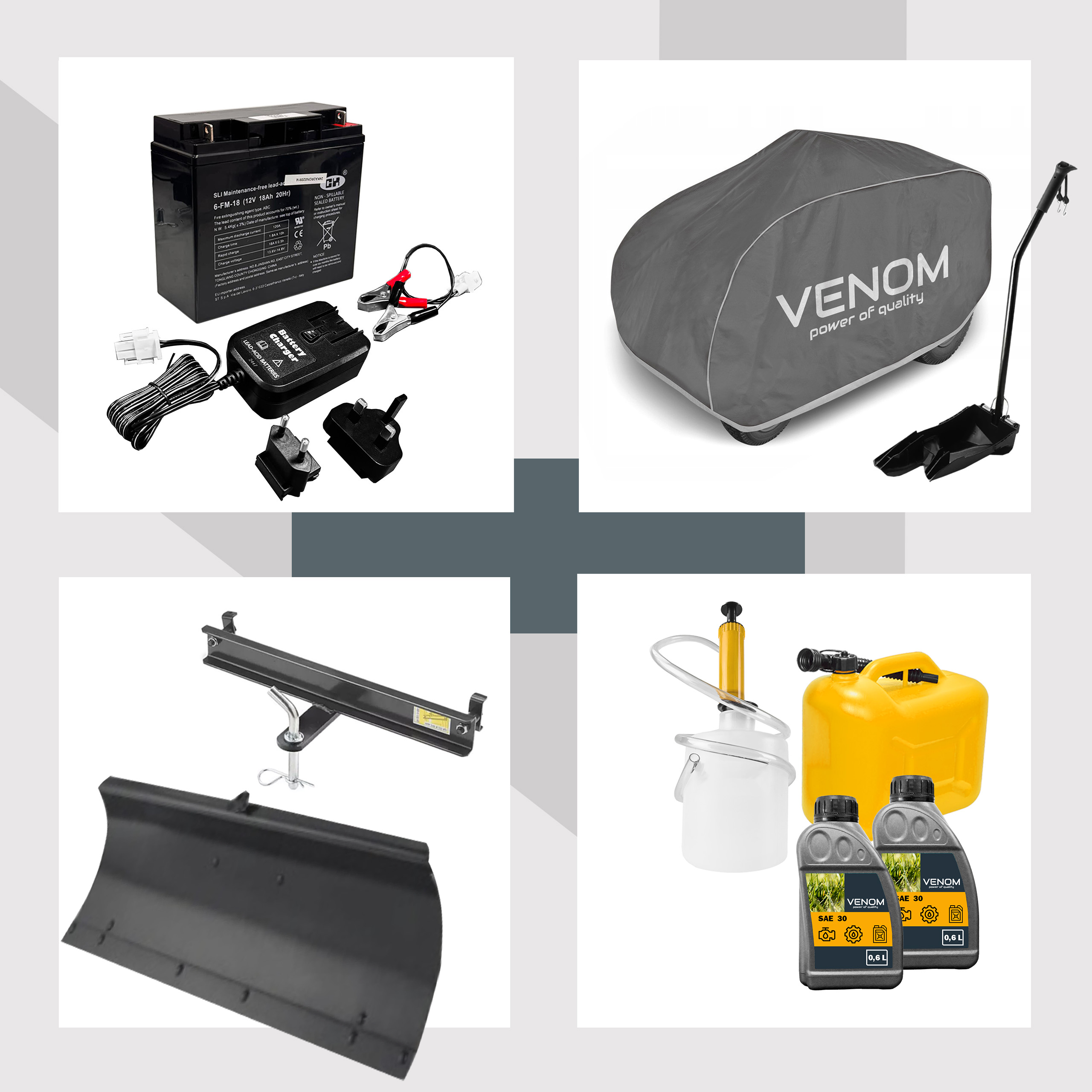 W zestawie - Wkładka mulczująca, Pług, Oleje silnikowe, Kanister, Odsysarka, Pokrowiec, Zaczep, Ładowarka do akumulatora