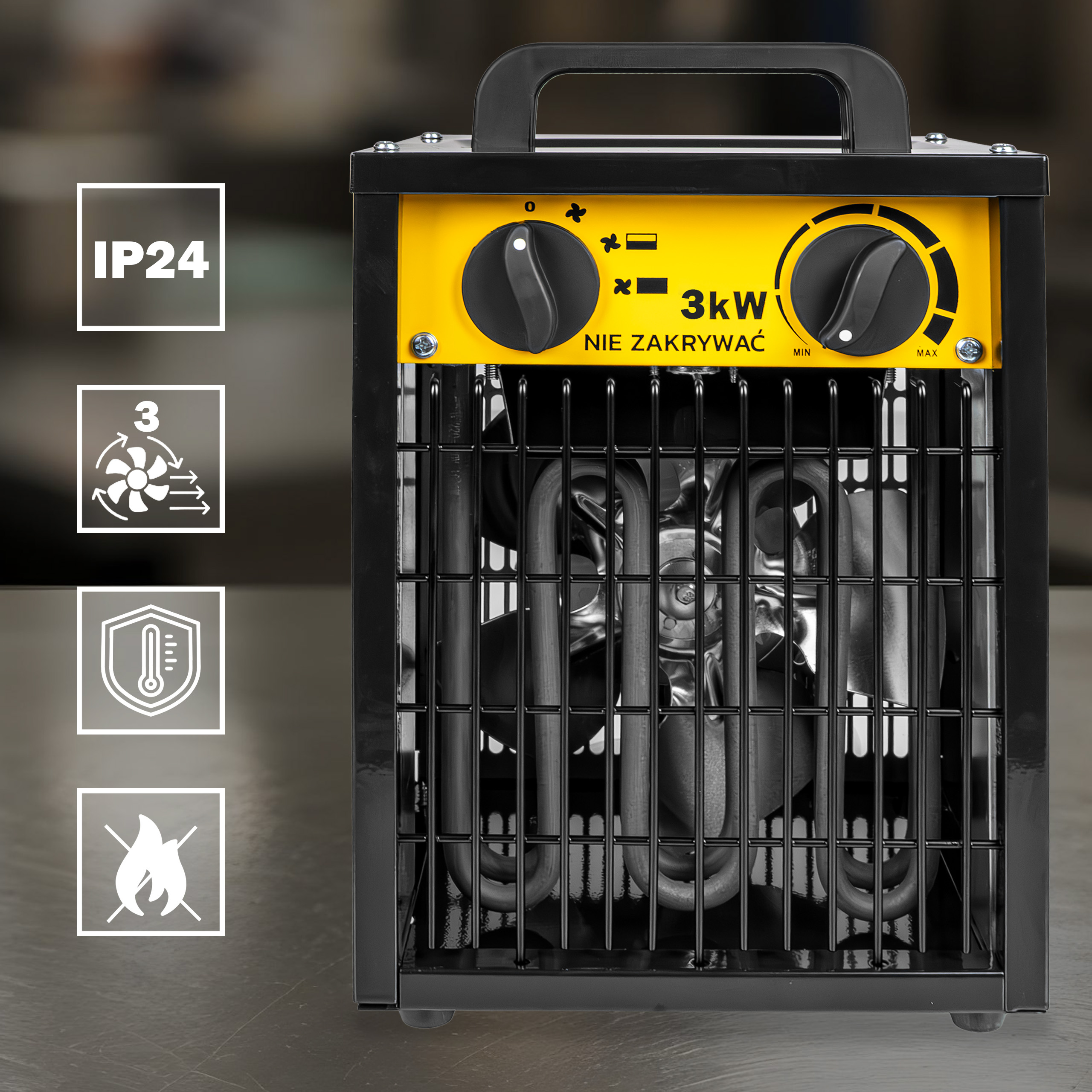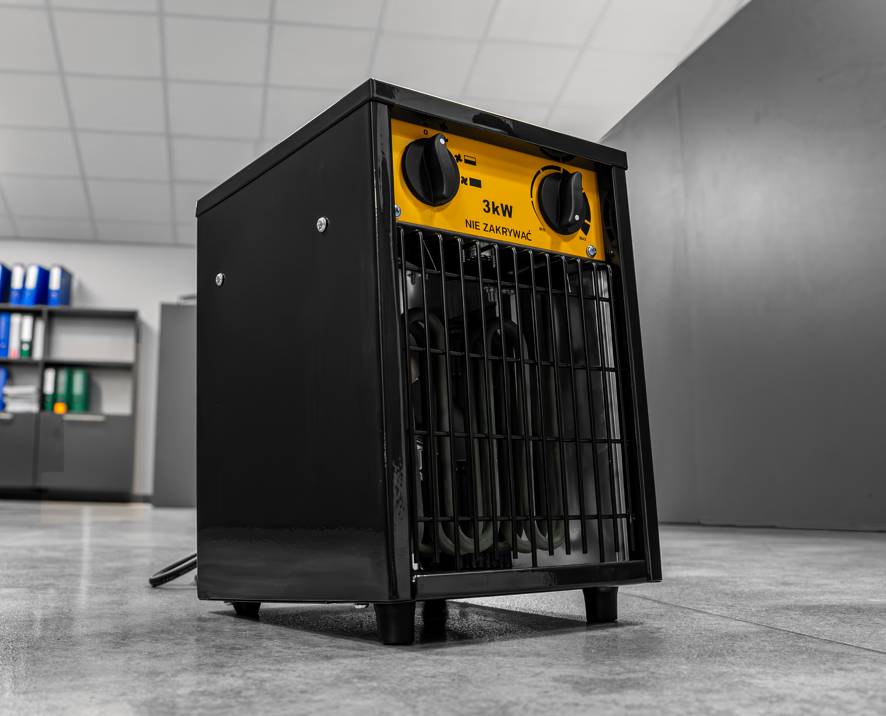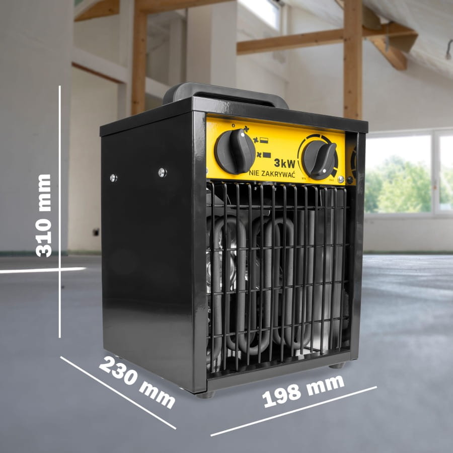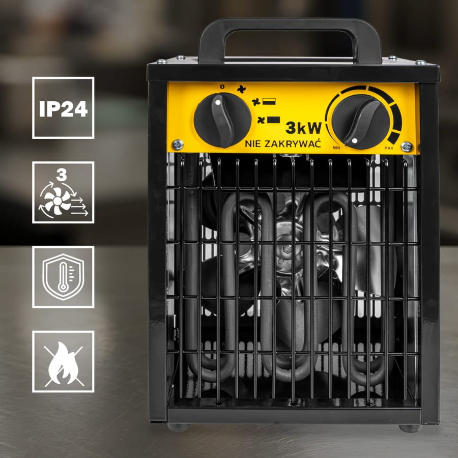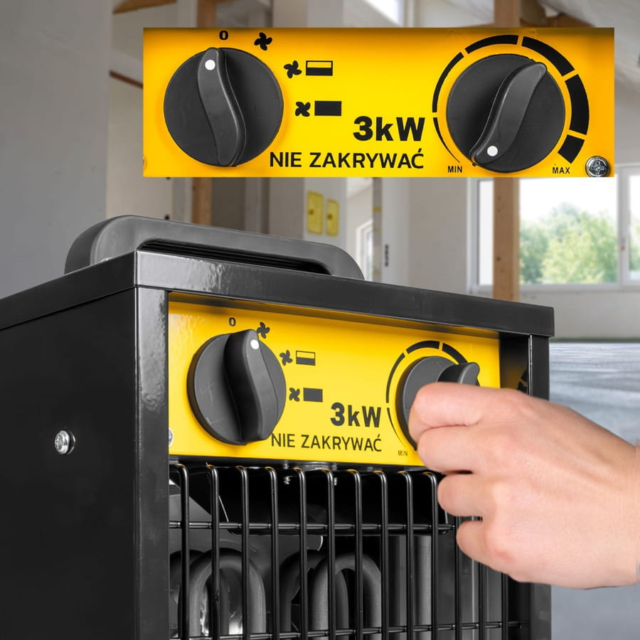 Moc 3000 W pozwala w kilka chwil podnieść temperaturę w pomieszczeniu. Idealna do garaży, warsztatów, magazynów czy domów, gdy potrzebujesz natychmiastowego komfortu cieplnego.