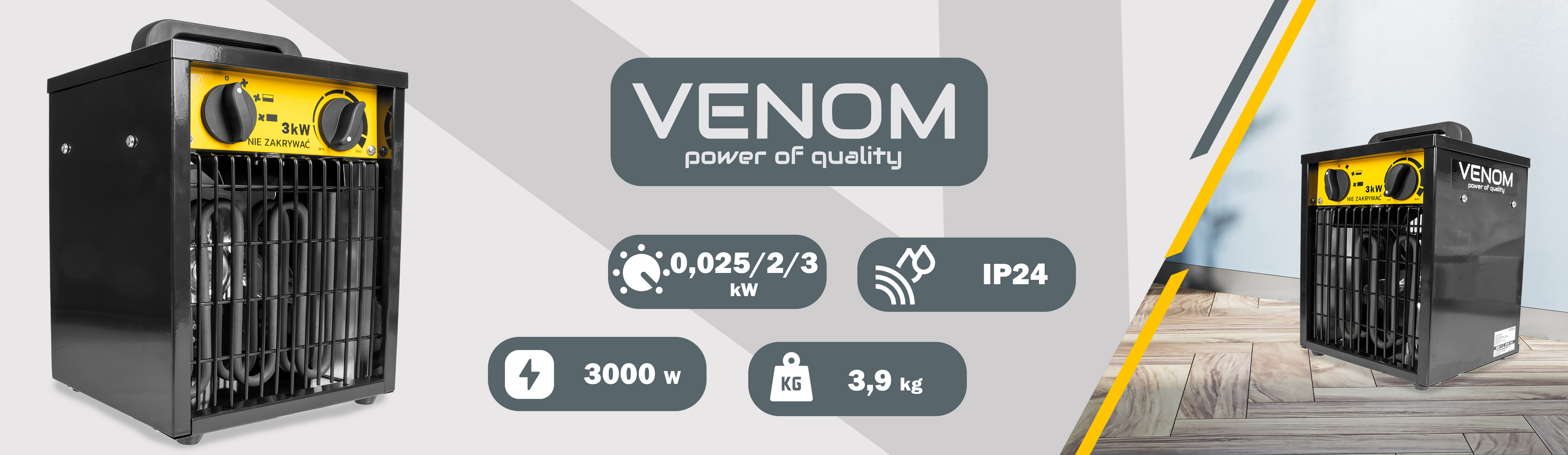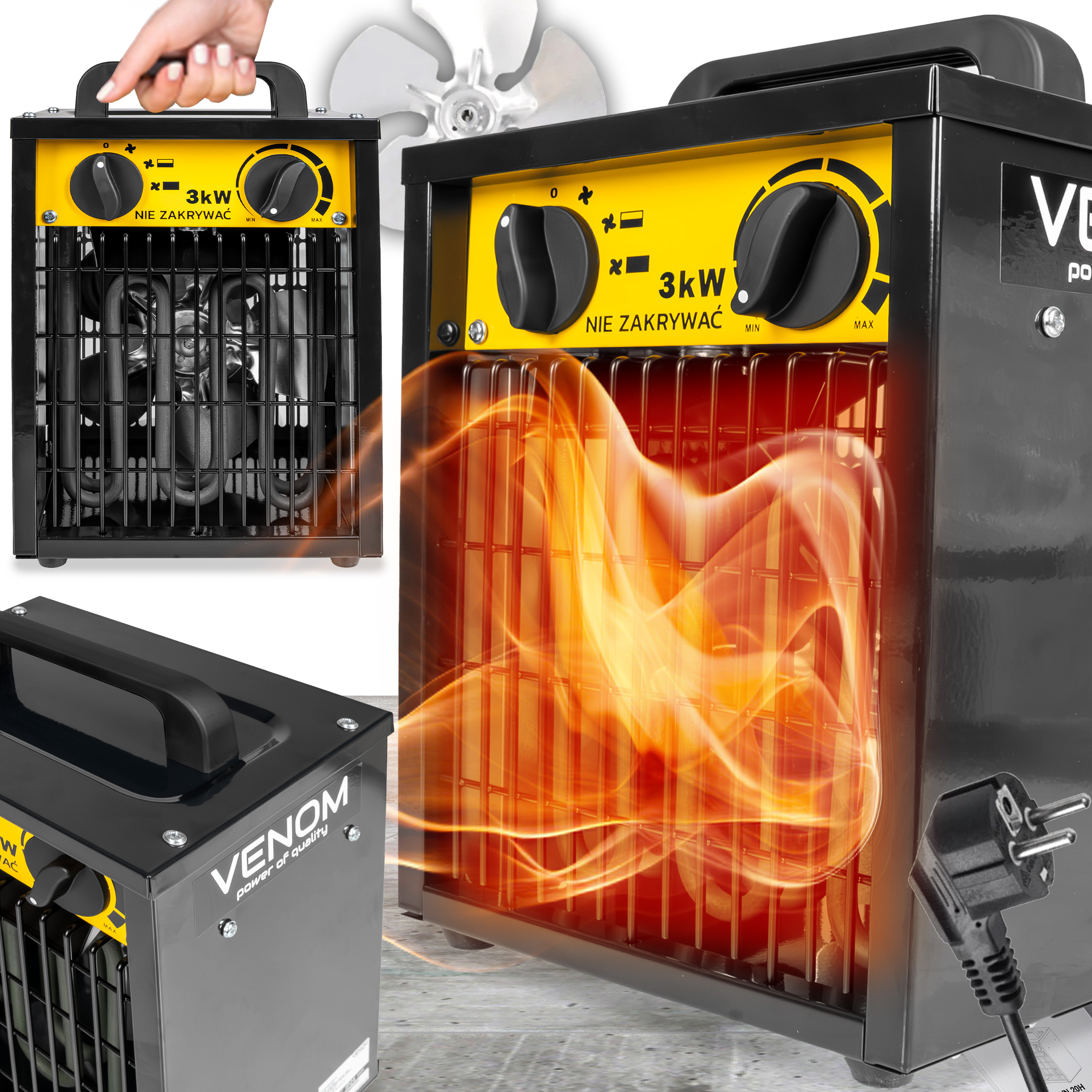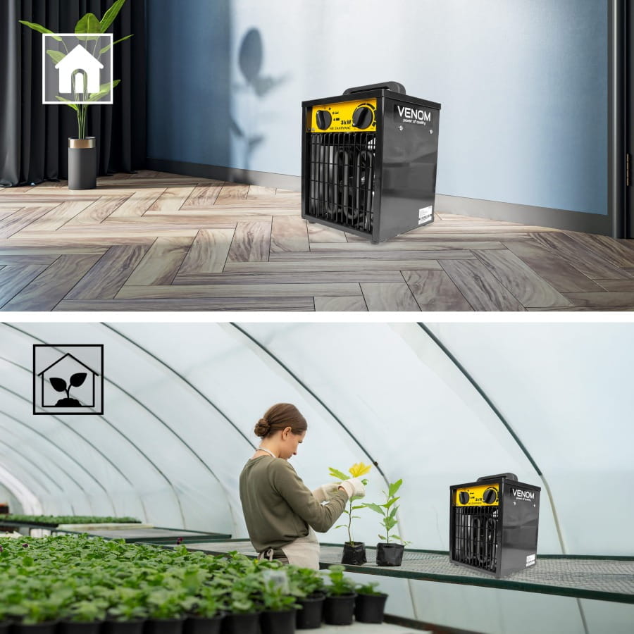 ✅ VENOM HeatFlow 3000™ – nagrzewnica elektryczna o mocy 3000 W, która błyskawicznie podnosi temperaturę w pomieszczeniu, zapewniając szybki komfort cieplny.