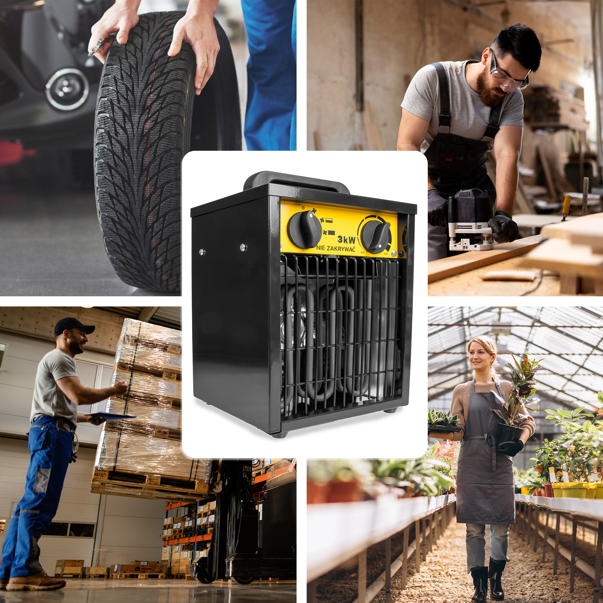 - Komfortowe ogrzewanie warsztatów, garaży i innych przestrzeni roboczych