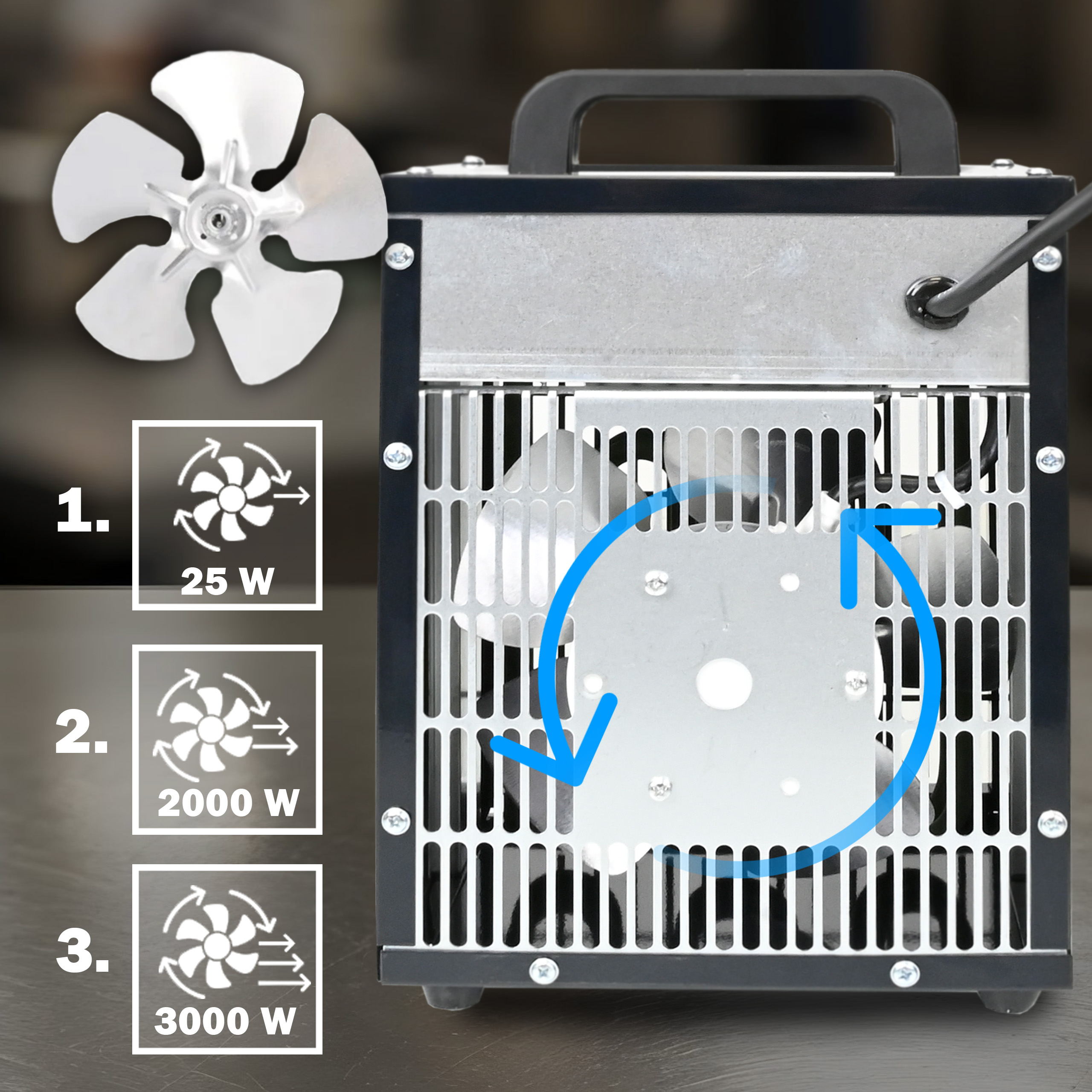 ✅ 3-stopniowa regulacja mocy (25/2000/3000 W) – pełna kontrola nad komfortem cieplnym