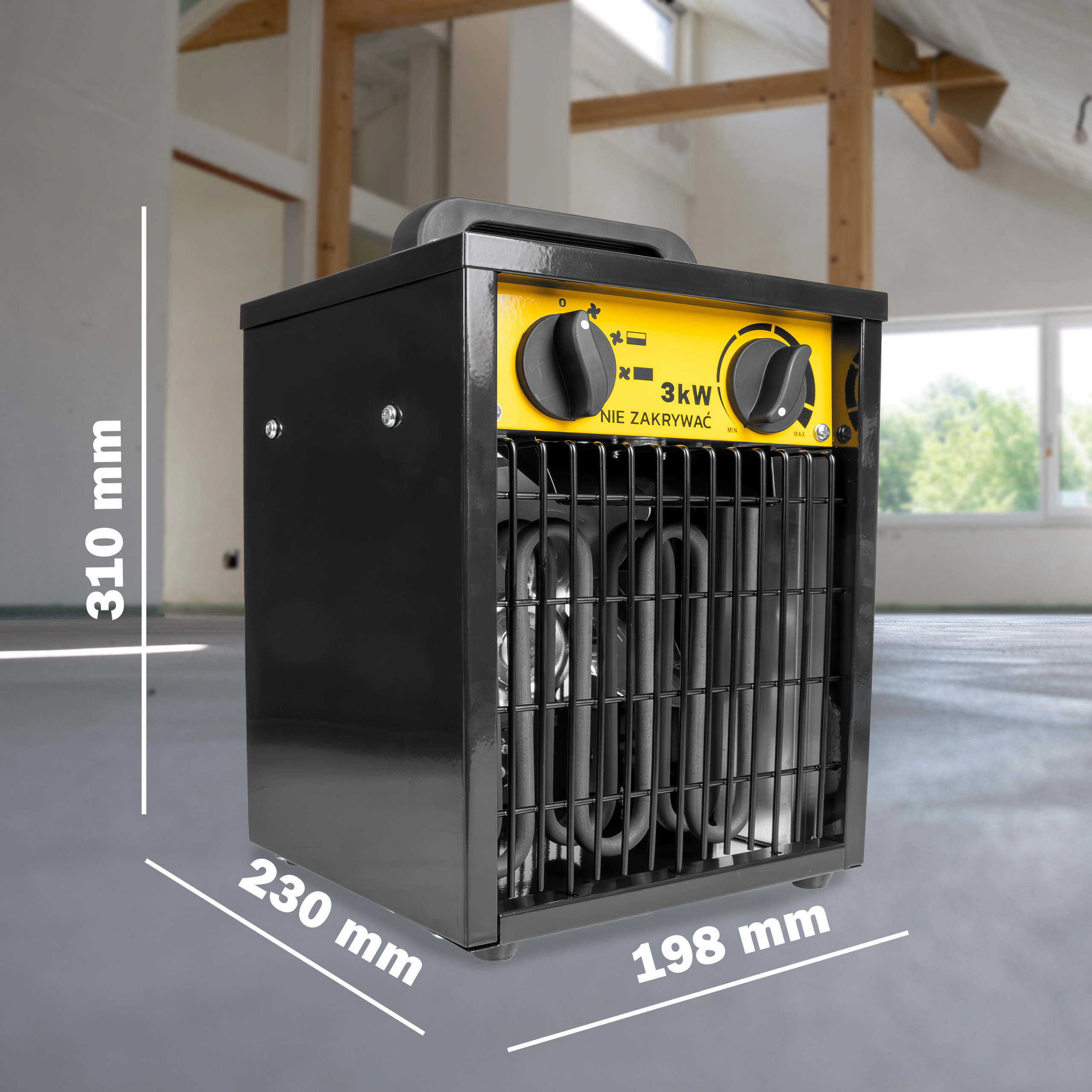 Kompaktowa konstrukcja (198 × 230 × 310 mm) i waga 3,9 kg oraz ergonomiczny uchwyt do przenoszenia zapewniają łatwe ustawienie nagrzewnicy tam, gdzie jest potrzebna.