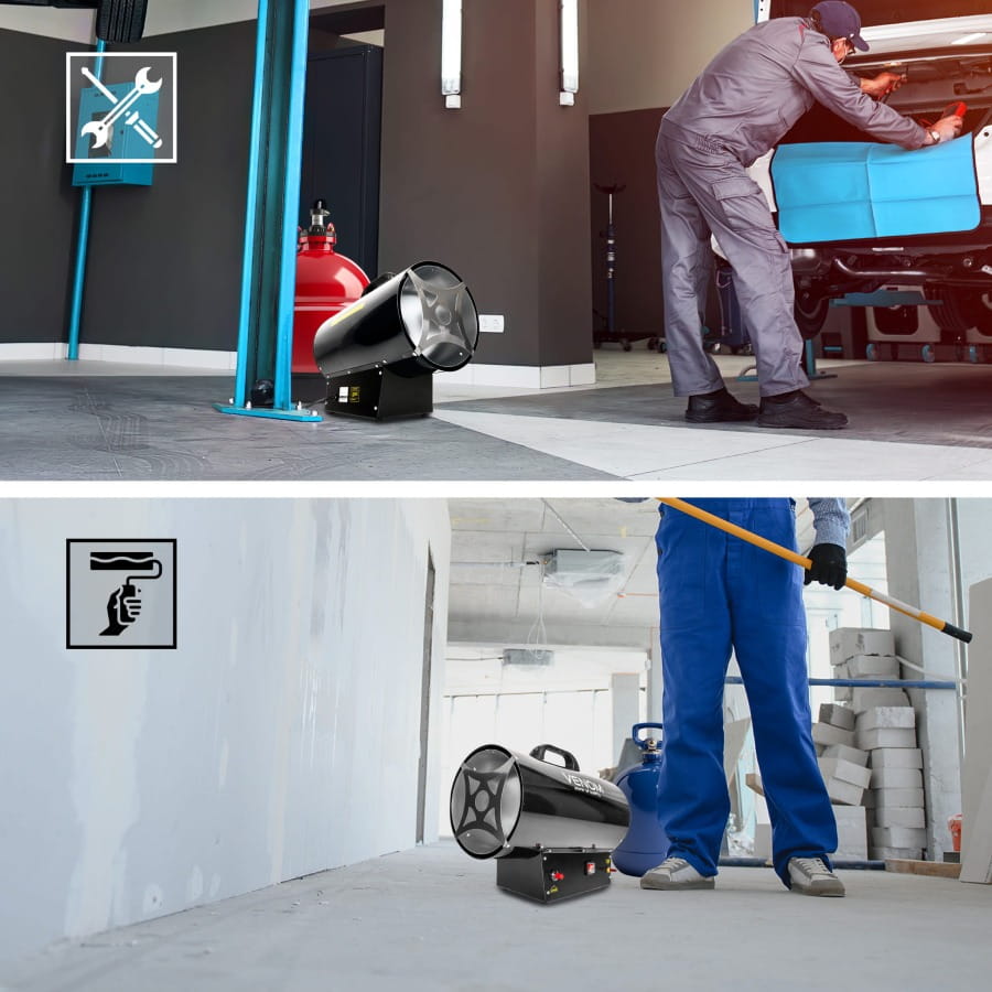 Idealna do hal, warsztatów, magazynów, garaży i przestrzeni budowlanych, gdzie liczy się natychmiastowy efekt cieplny i pełna efektywność pracy.