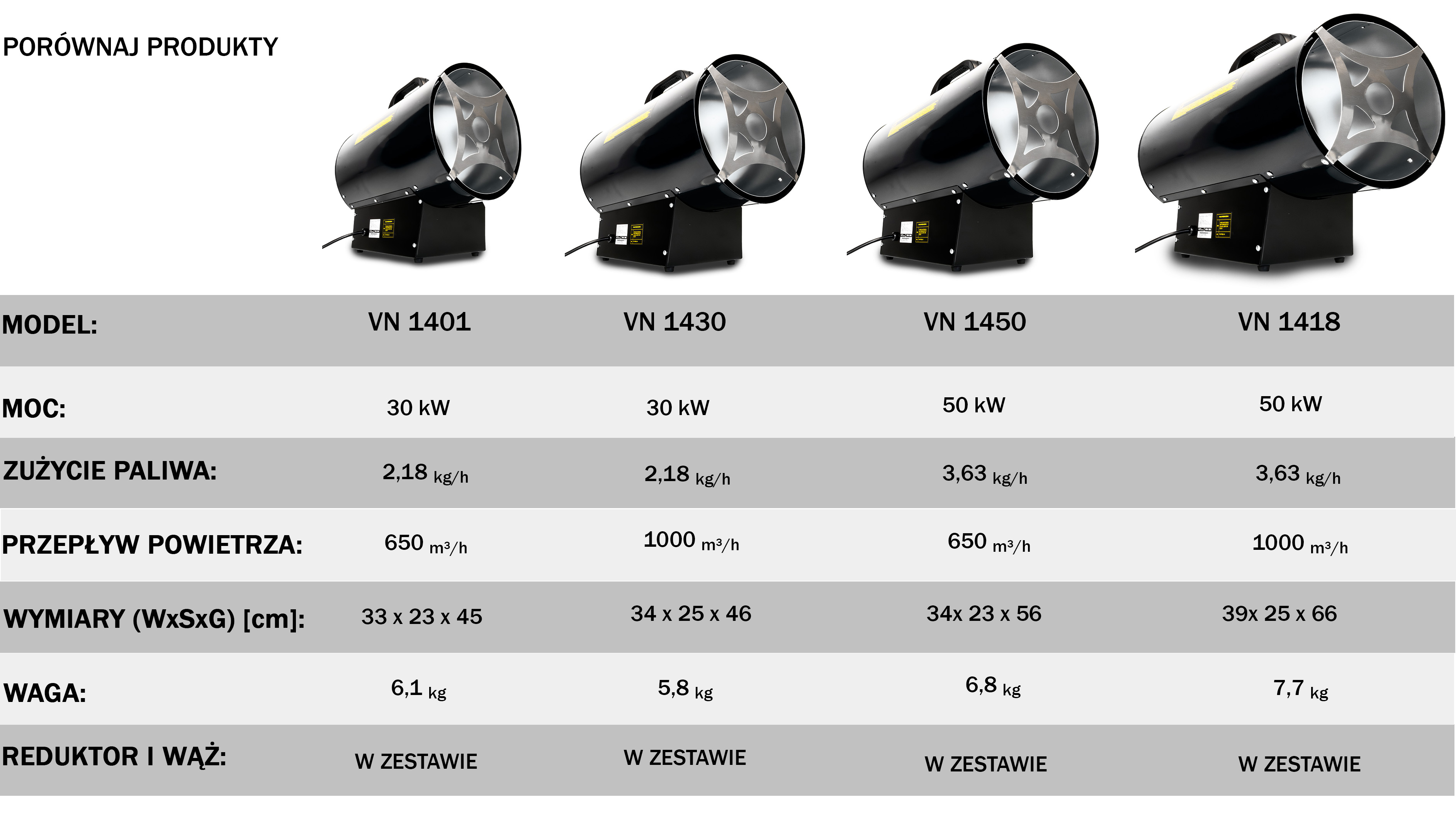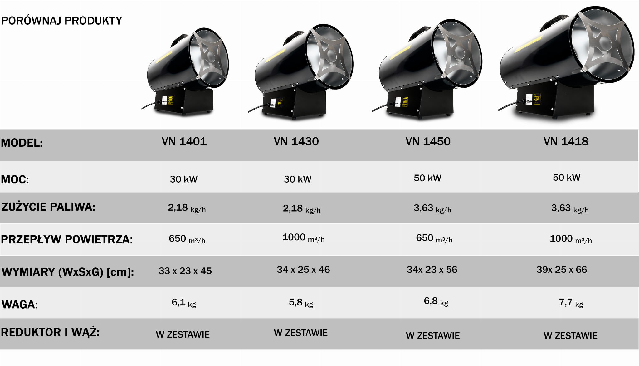 Każdy model ma w zestawie reduktor i wąż gazowy, a wszystkie cechuje wysoka efektywność, bezpieczeństwo (IPX4) i trwała konstrukcja stalowa.