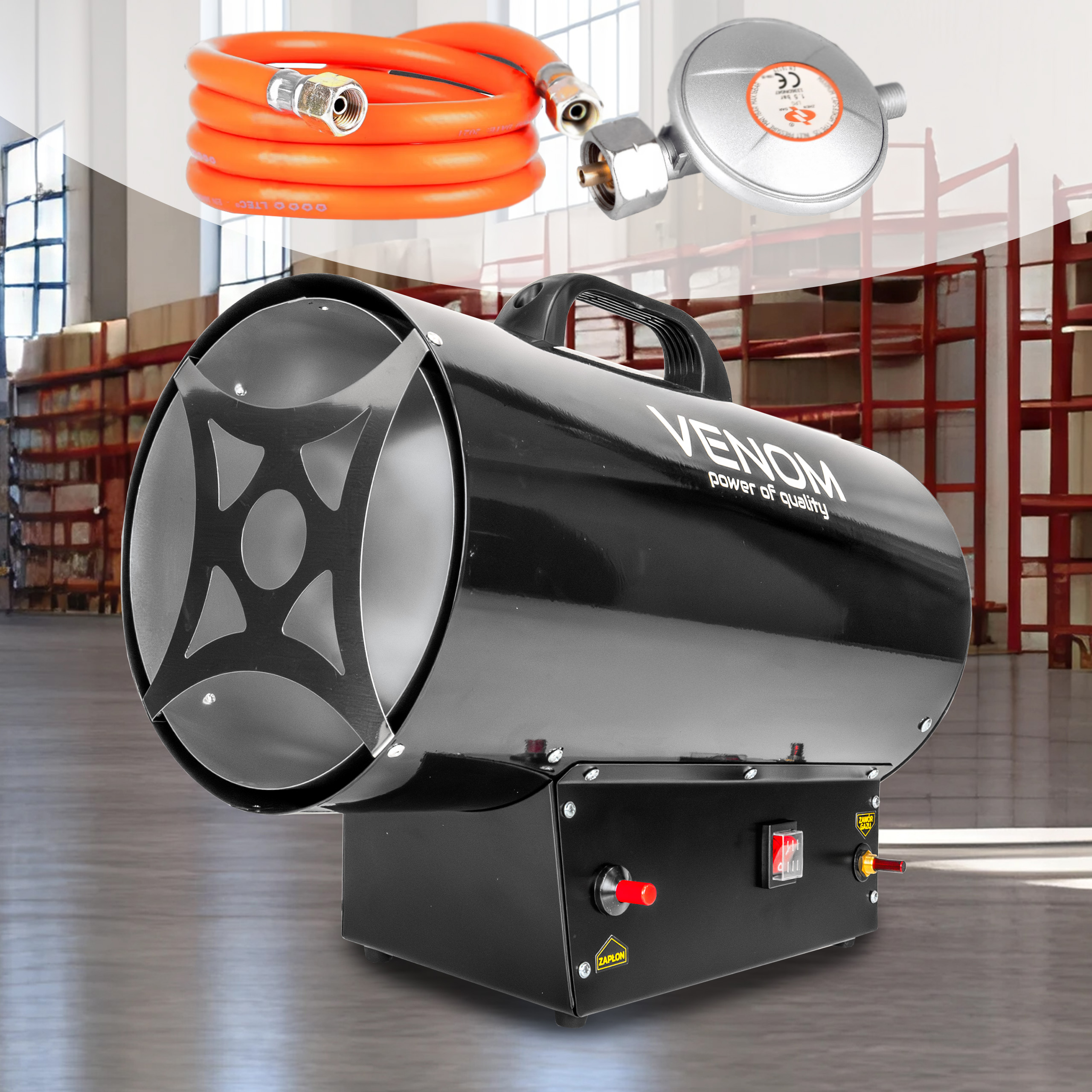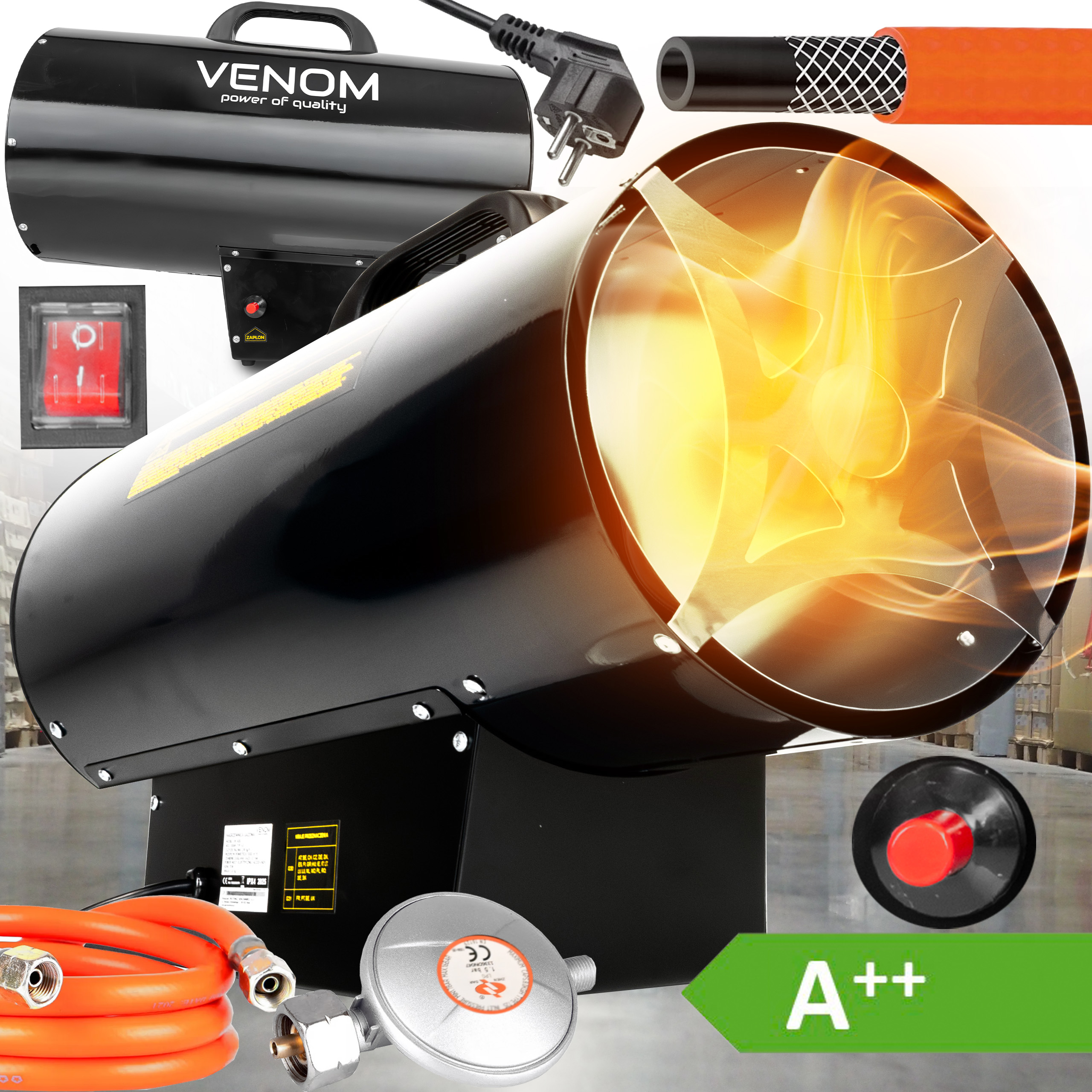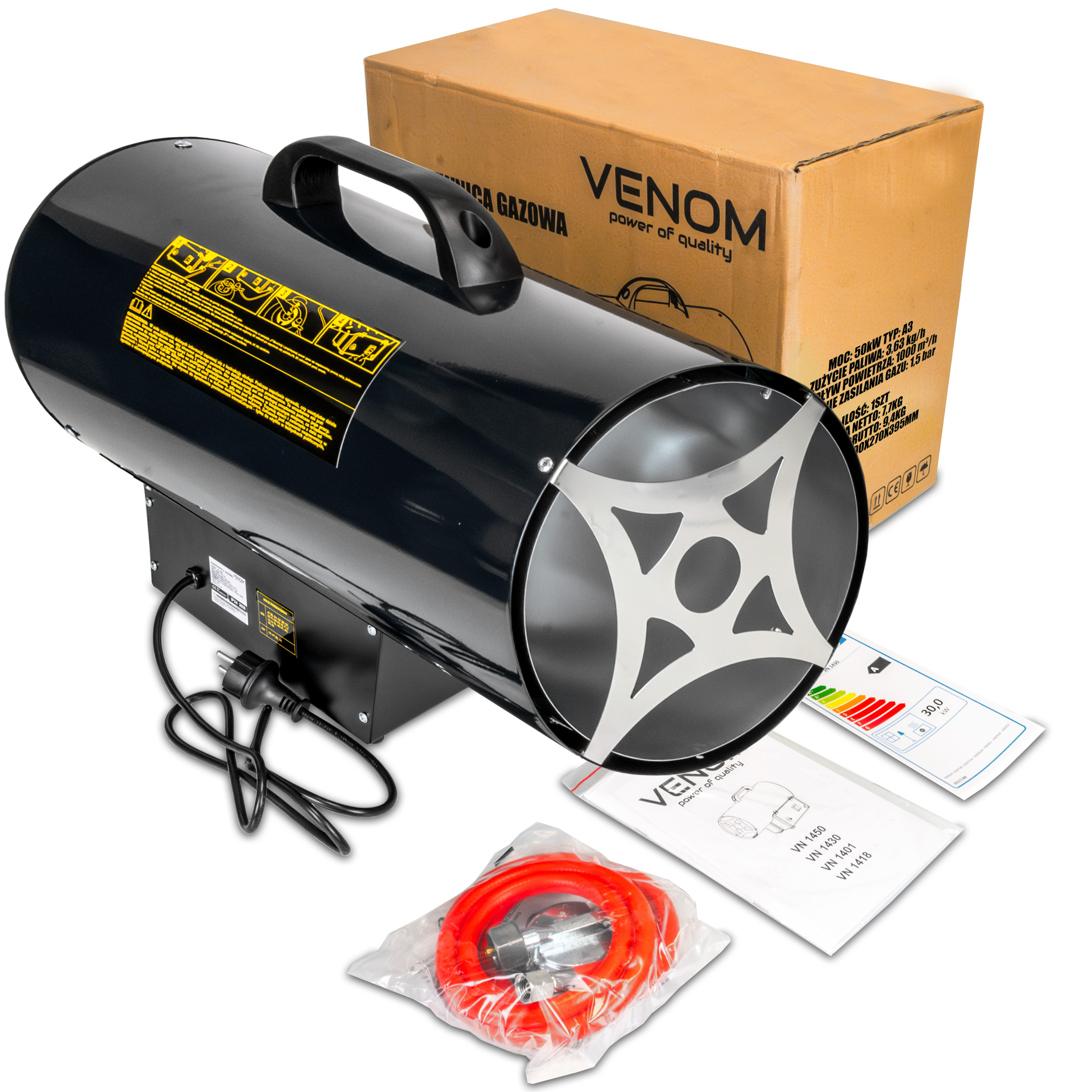 ✅ VENOM PowerHeat 50kW™ – nagrzewnica gazowa o mocy 50 000 W, która w kilka minut podnosi temperaturę nawet w dużych pomieszczeniach.