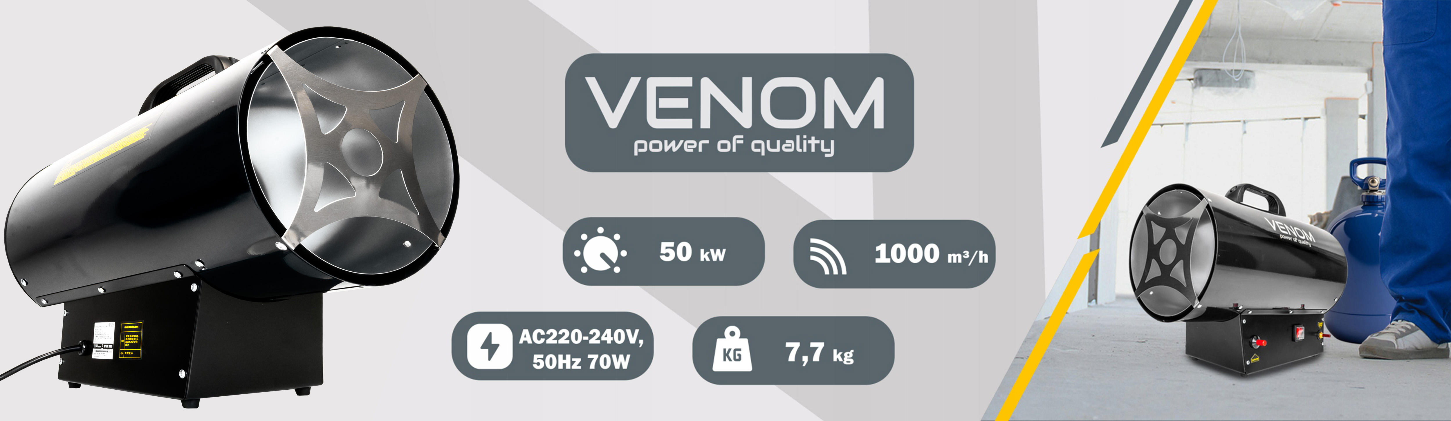 ➤ VENOM 1450 (50 kW) – mocna, a jednocześnie lekka (6,8 kg). Doskonała do hal przemysłowych i placów budowy.