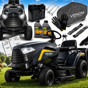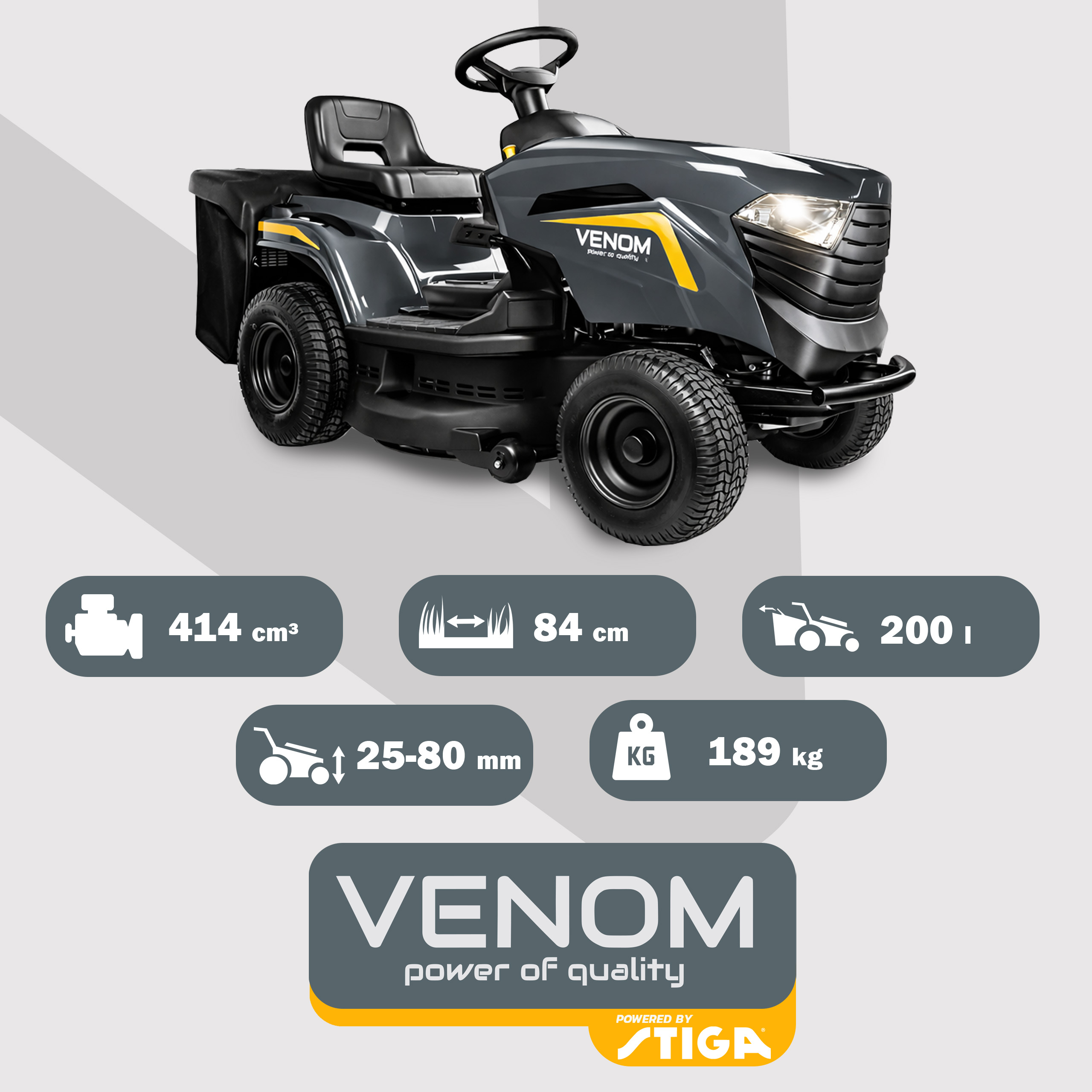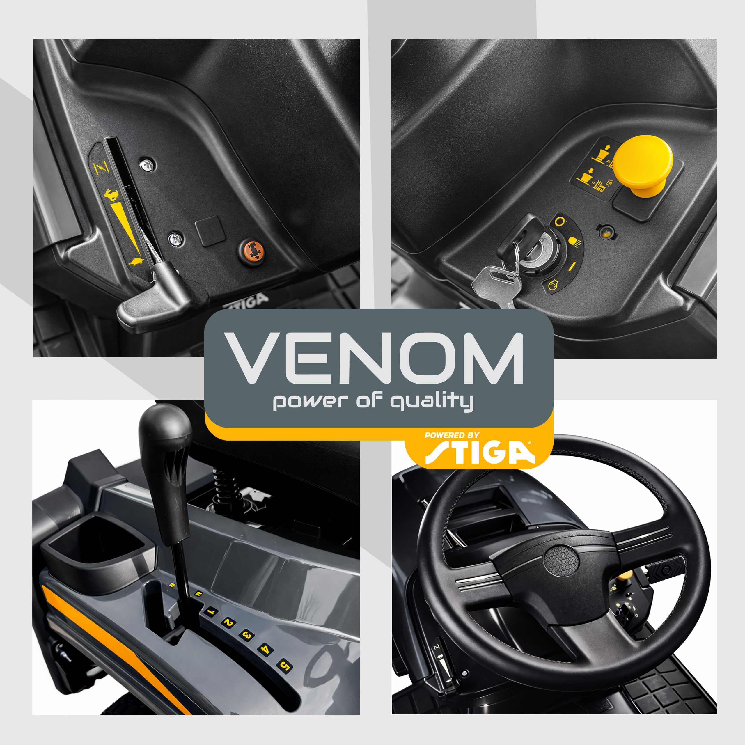 VENOM by STIGA Nowoczesny Traktorek Ogrodowy / Silnik STIGA 414 cm³ / Kosz 200 L / 7-stopniowa regulacja wysokości koszenia / Manualna skrzynia biegów